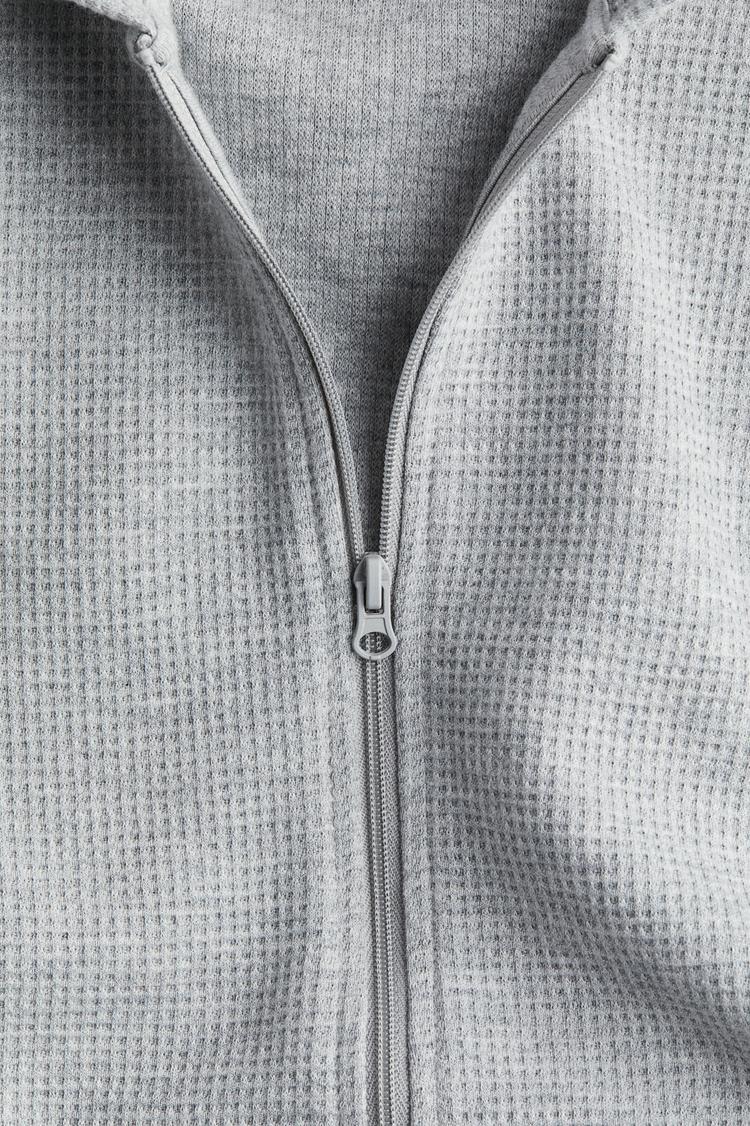 This light gray waffled jacket features a hip-length silhouette with a regular fit, ideal for casual and streetwear looks. Crafted from textured cotton fabric, it includes a hooded neckline and long regular sleeves for comfortable coverage. The front zipper closure adds practicality, complemented by functional pockets and an adjustable hood for versatility. Perfect for spring and autumn wear, this jacket blends casual chic style with everyday functionality, making it an excellent choice for travel, casual outings, or layered street style.