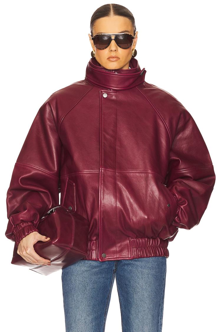 This oversized leather bomber jacket features a matte dark red finish with a stand collar and long drop-shoulder sleeves. The waist-length silhouette is enhanced by elasticized cuffs and hem for a comfortable, relaxed fit. Crafted from genuine leather with a viscose lining, it offers a smooth feel and durability. Functional side flap pockets with button snaps and a hidden front zipper closure add both style and utility. Perfect for casual outings, streetwear looks, and travel, this classic chic bomber blends timeless design with modern comfort.