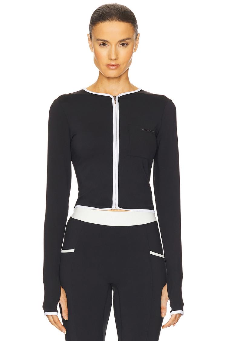 This Heroine Sport Skylar Jacket features a fitted blouson silhouette in sleek black jersey fabric with white trim accents for a minimalist sporty chic look. It has a waist-length cut with long regular sleeves and a round neckline. The front zipper closure is complemented by a hidden hook and bar clasp for a secure fit. Notable design details include a patch pocket on the chest and distinctive cut-out details at the sleeve cuffs. Ideal for casual wear, athleisure, and workout occasions, this jacket blends comfort and style effortlessly.
