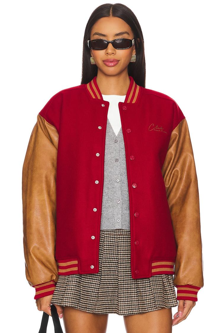 This varsity bomber jacket combines classic style with streetwear edge in a relaxed fit. Featuring a hip-length silhouette, it has a band collar and long regular sleeves finished with ribbed trim. The body is crafted from midweight melton polyester fabric in vibrant red, contrasted by tan faux leather sleeves for a textured look. Front snap button closure and side slant pockets add functional flair, while tonal embroidered logo detail at the breast provides subtle branding. Lined with polyester and cotton blend for comfort, this jacket is ideal for casual outings, street style looks, and travel layering during autumn and spring.