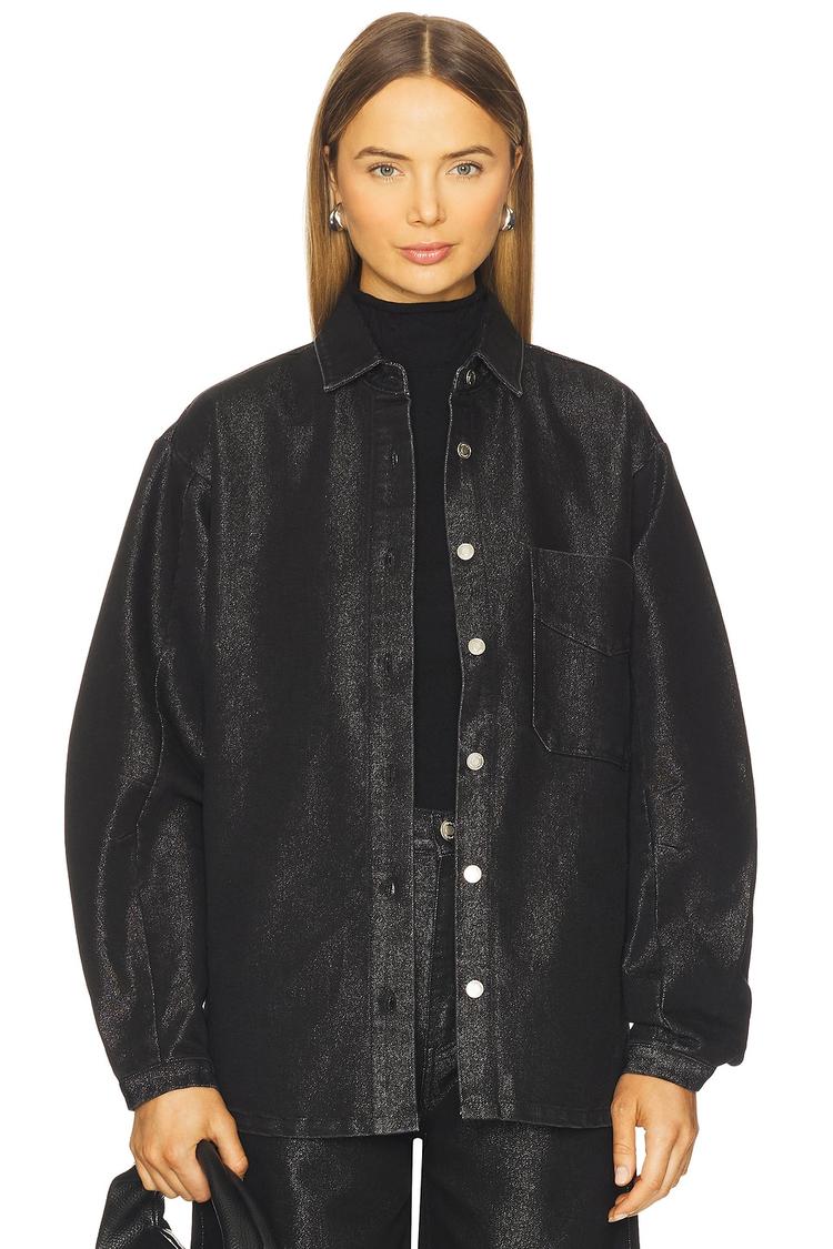 This hip-length shacket combines the sturdy texture of rigid denim with subtle metallic threading for a modern shimmer effect. Featuring a classic turn-down collar and regular long sleeves, it offers a regular fit for comfortable layering. The front button closure enhances its minimalist aesthetic, making it ideal for casual, streetwear, and travel occasions during spring, autumn, and winter. Its matte black base color with a shiny finish adds to its versatile, chic appeal.