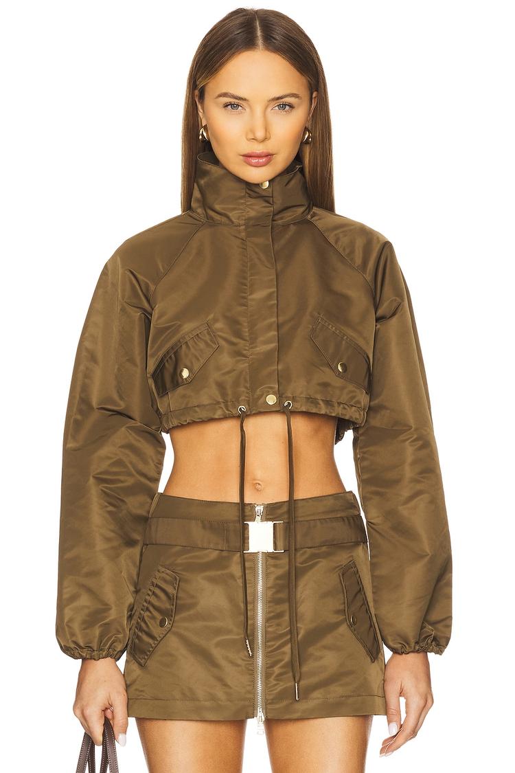 This cropped blouson jacket in matte olive sateen fabric features a stand collar and long regular sleeves with elastic cuffs. Its adjustable drawstring waist and front zipper with button closures offer a tailored fit, while flap pockets with button details provide practical style. The jacket's lightweight, matte finish and patch detailing on front and back enhance its modern street style appeal. Perfect for casual outings, streetwear looks, or travel in transitional seasons, this midweight jacket balances function and fashion with an adjustable silhouette and subtle design accents.