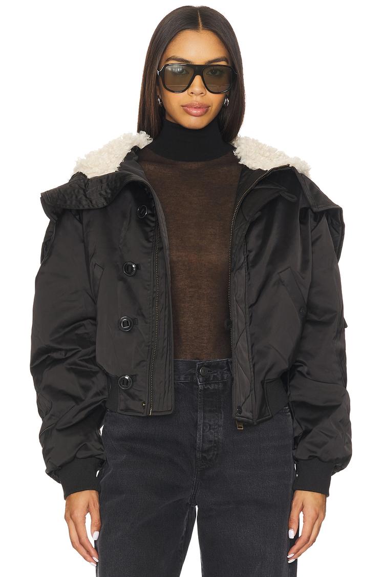 This black bomber jacket features a regular fit with long drop-shoulder sleeves and a hooded neckline trimmed with off-white faux fur. Crafted from midweight ripstop polyester with a polyamide lining, it offers both warmth and durability. The waist-length silhouette is secured with a front zipper and button closure, complemented by snap button pockets for added practicality. Ideal for casual, streetwear, and travel occasions in autumn and winter, this trendy piece blends functionality with stylish design details like exposed zippers and faux fur trim on the hood.