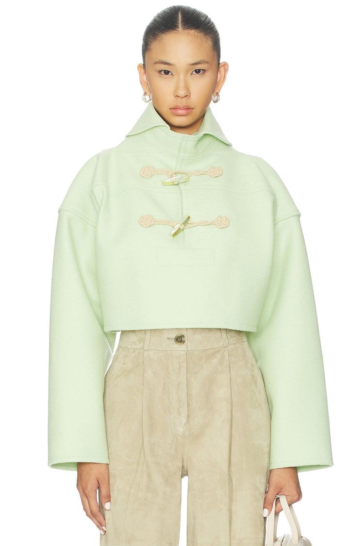 This boxy cropped vareuse jacket in soft light green wool offers a modern minimalist silhouette ideal for transitional seasons. Featuring a high neck collar and long sleeves, the midweight melton fabric provides warmth while maintaining structure. The toggle closures at the front add a subtle design detail that enhances the chic yet casual vibe. With a covered back and cropped length, this jacket pairs perfectly with high-waisted trousers for streetwear or casual workwear occasions. Its pull-on styling and partial toggle-button closure make it both stylish and easy to wear.