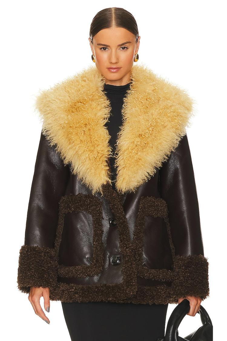This relaxed-fit blouson jacket features a matte dark brown faux leather body accented with a textured matte light beige faux fur trim along the oversized lapel collar, cuffs, hem, and front. The hip-length silhouette and long sleeves provide cozy coverage, while front button closure and slip pockets add classic functionality. Crafted with a polyester lining, this autumn-winter jacket blends vintage-inspired charm with casual chic style, perfect for casual outings, streetwear looks, and travel layering.