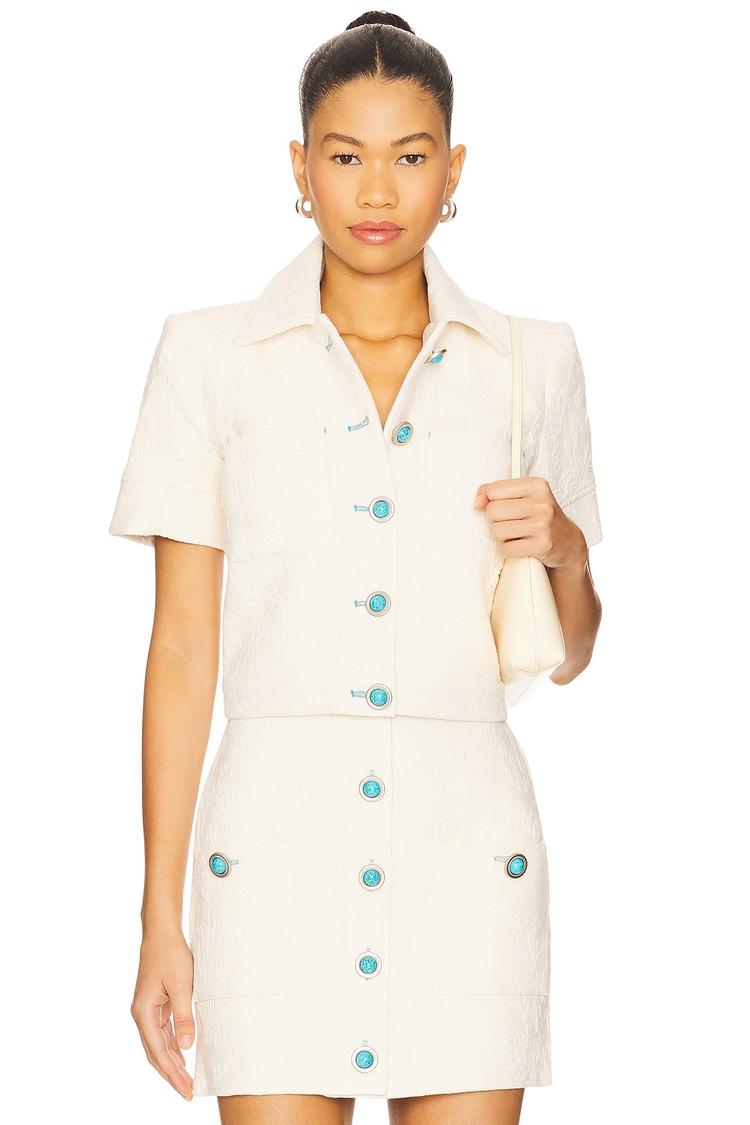 This cropped short sleeve jacket features a fitted silhouette crafted from a midweight cotton jacquard fabric with polyester lining for comfort. The off-white color is accented by striking blue buttons and padded shoulders, lending a structured yet chic appearance. Designed with a classic turn-down collar and front patch pockets, it closes with front buttons, emphasizing its minimalist style. Ideal for spring through autumn, this jacket suits casual outings, business casual settings, and conferences, offering a polished yet approachable look.
