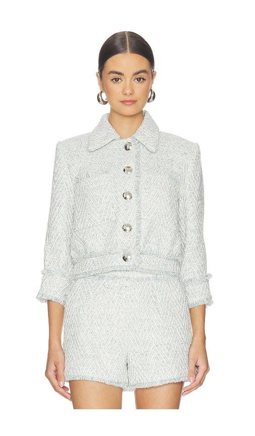 L'AGENCE JIA CROP 3/4 SLEEVE FRINGE JACKET IN BLUE,IVORY.