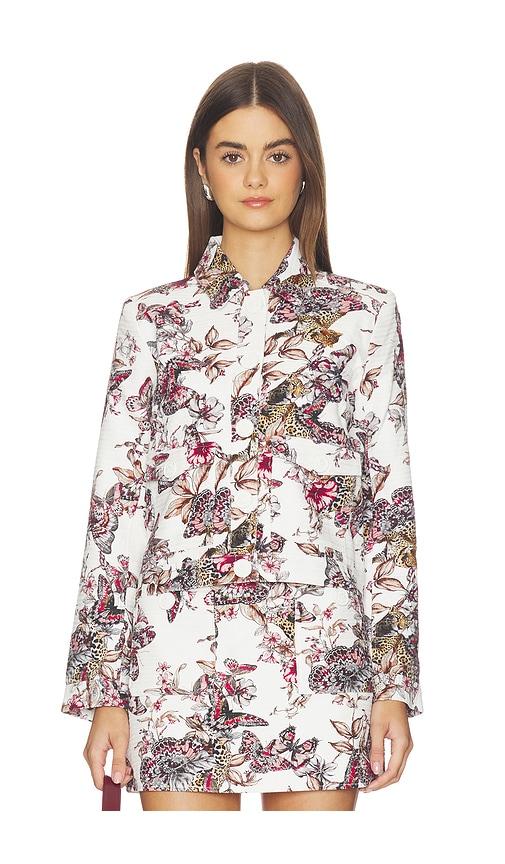 L'AGENCE NYX CROP JACKET IN WHITE MULTI LARGE BUTTERFLY JUNGLE IN WHITE,PINK.