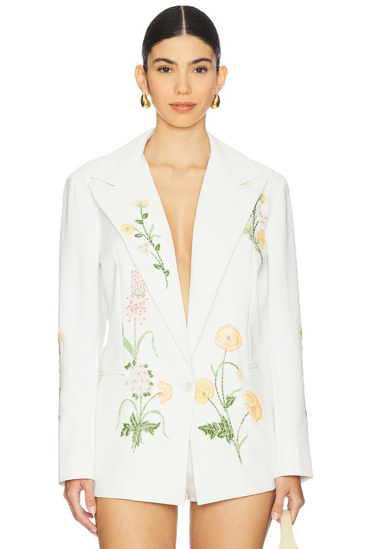 This tailored single-breasted blazer in crisp white crepe fabric features delicate floral embroidery in soft green, pink, yellow, and peach hues on the front and sleeves. Designed with a notch lapel collar and long regular sleeves, it offers a structured silhouette enhanced by padded shoulders. The hip-length jacket closes with front buttons and includes slip pockets for functional style. Perfect for spring and summer business casual looks, conference wear, or elevated casual outings, this elegant piece combines classic tailoring with chic floral details for a refined seasonal statement.