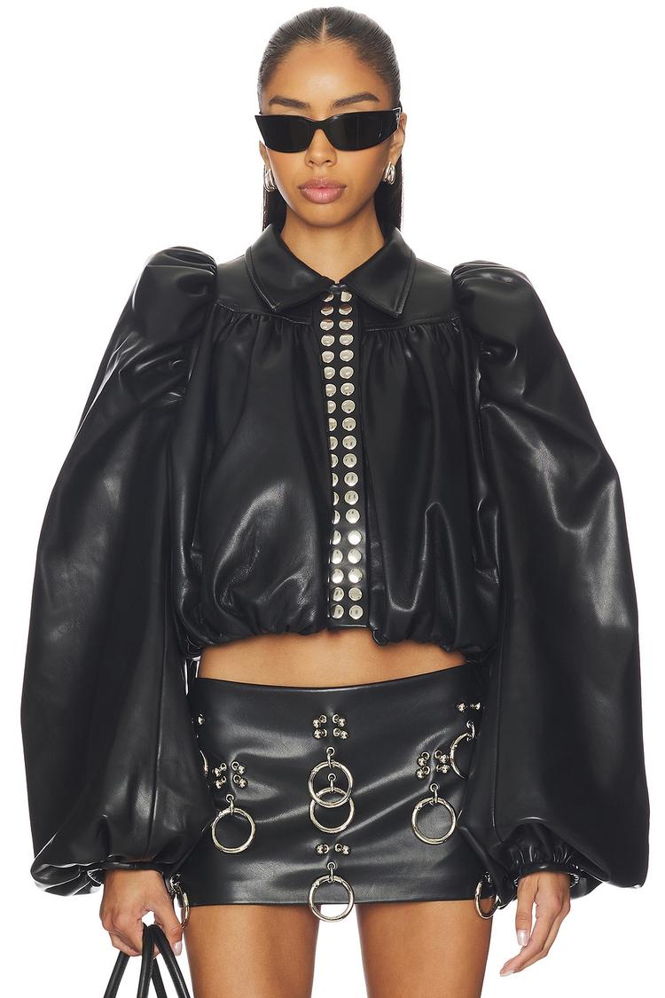 This cropped blouson jacket features a matte black heavyweight faux leather fabric with a loose fit and voluminous, baggy drop-shoulder sleeves. The turn-down collar and front dual-column snap button closures add a modern edge to the piece. Fully lined in cotton for comfort, this edgy jacket suits casual streetwear and night out occasions during autumn and winter. Its bold silhouette and textured finish provide a standout style statement, while the covered back and lightweight lining ensure wearability and versatility.
