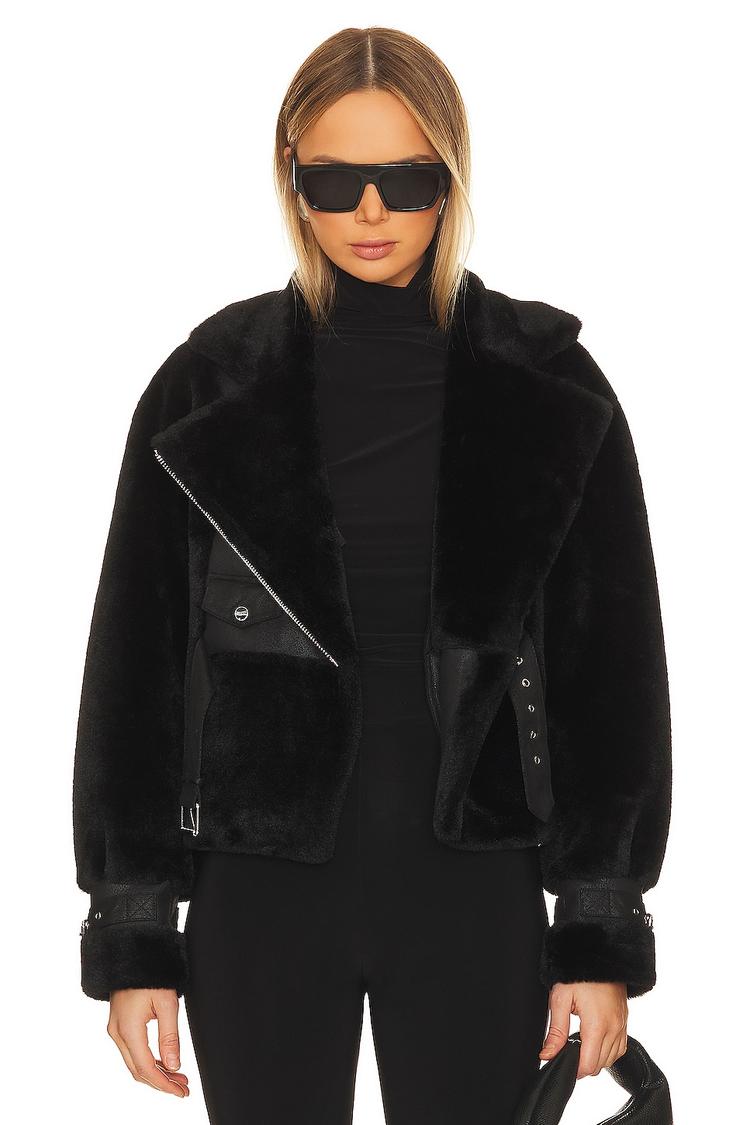 This Elody jacket features a modern, edgy silhouette with a waist-length cut and regular fit. Crafted from plush faux fur polyester, it offers warmth and style ideal for autumn and winter. The jacket includes a front zipper closure paired with an attached waist belt featuring a buckle, complemented by belted cuffs and lapel collar. Long cuffed sleeves and four functional pockets enhance its utility. Its solid black hue with matte finish and exposed zipper details make it perfect for casual streetwear, travel, or everyday wear with a chic flair.