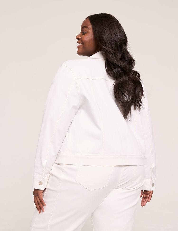 This classic plus-size denim jacket in crisp white offers a timeless blouson silhouette with a regular fit. Crafted from cotton denim fabric, it features a waist-length cut, a turn-down collar, long sleeves with button cuffs, and a button-front closure. Practical design details include two chest pockets and two side pockets on the front. Perfect for casual occasions, loungewear, and travel, this versatile jacket layers effortlessly over dresses, tees, or lounge sets, making it a staple for spring and autumn wardrobes.