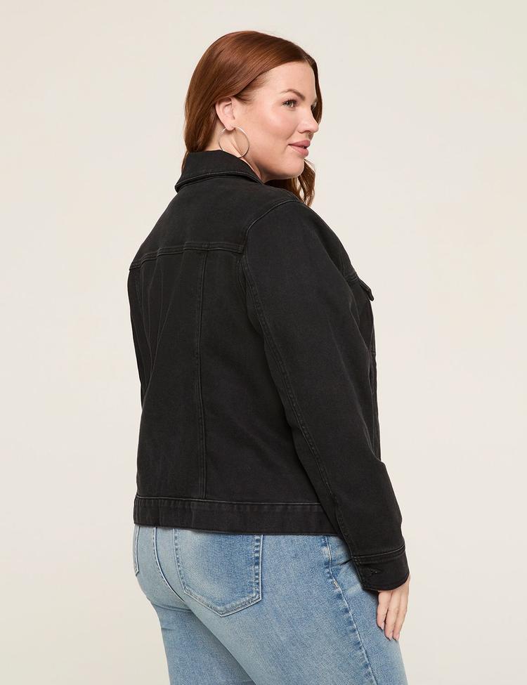 This classic black denim jacket features a relaxed fit with a waist-length blouson silhouette, perfect for plus sizes. Crafted from durable cotton denim, it has a traditional turn-down collar, long regular sleeves with button cuffs, and a button-front closure. Practical chest and side patch pockets add functional style. The jacket's solid matte black color and patch design details create a timeless casual chic look. Ideal for casual wear, loungewear layering, or travel during spring and autumn seasons, this versatile piece pairs effortlessly with dresses, jeans, or graphic tees.