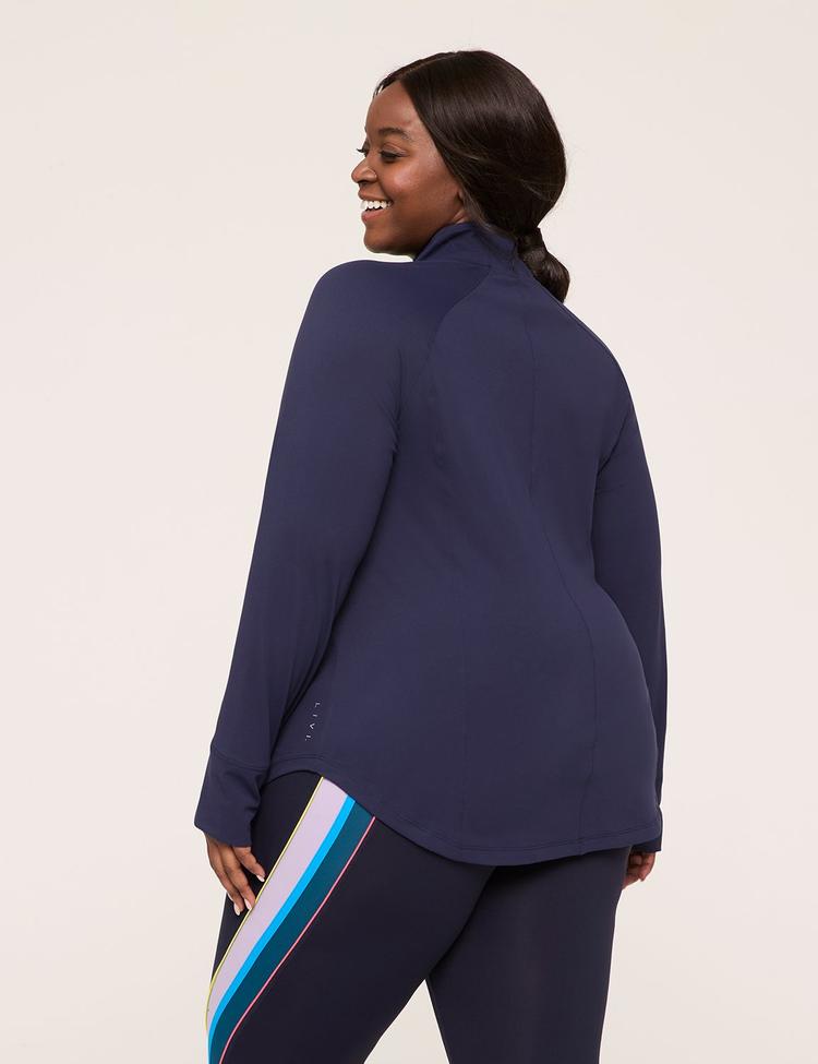 This fitted blouson jacket in deep navy features a stand collar and long sleeves with practical thumbholes, combining sporty and casual chic aesthetics. Made from a buttery-soft, four-way stretch polyester-spandex blend, it ensures flexibility and comfort. The hip-length silhouette is complemented by princess seams for a flattering shape and two front zipper pockets for convenience. Ideal for athleisure, casual outings, or workout sessions, this plus-size LIVI Soft Zip-Front Jacket offers functional style with a clean, solid design perfect for spring, autumn, or all-weather wear.