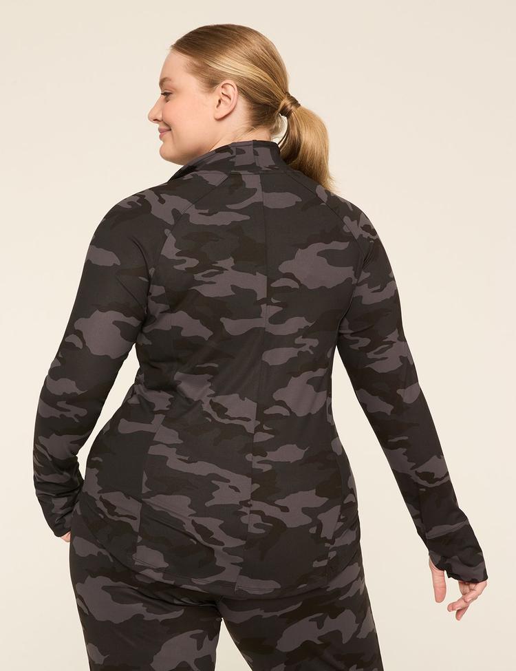This plus-size LIVI Soft Zip-Front Jacket features a classic, regular fit that embraces curves with ease. Crafted from a buttery-soft, light-as-air polyester-spandex blend, it offers 4-way stretch for maximum flexibility and comfort. The matte black and dark gray camouflage print covers the hip-length silhouette, accented by princess seams at the front for subtle shaping. Functional details include a stand collar, long sleeves with thumbholes, front zipper closure, and two front zipper pockets. Ideal for casual wear, workouts, and loungewear, this jacket supports active lifestyles with style and eco-friendly fabric construction.