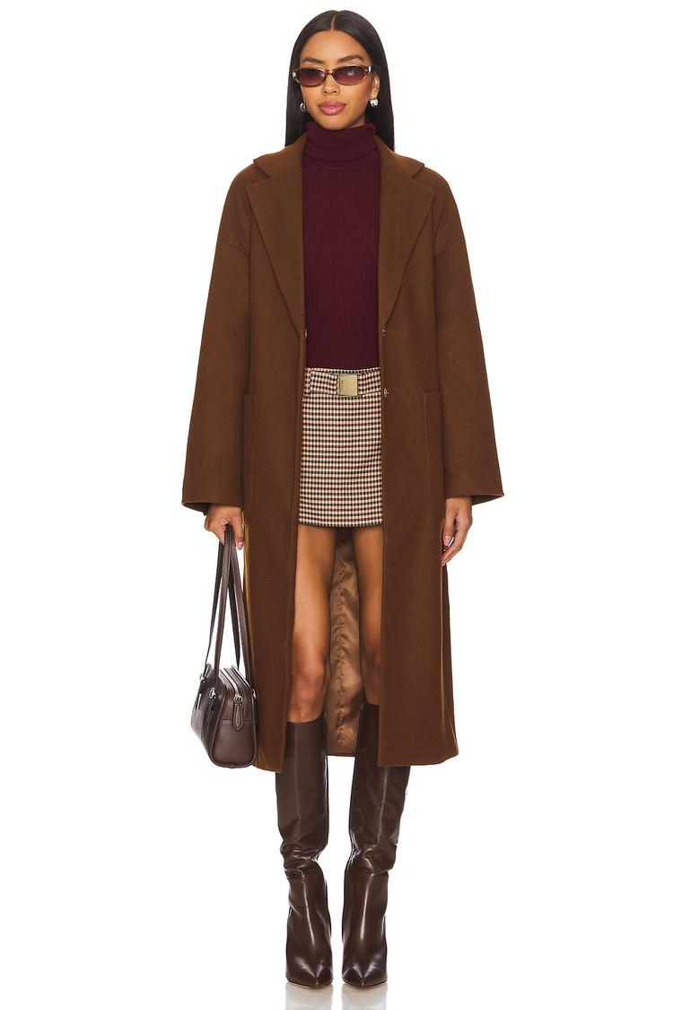 This matte brown single-breasted coat features a full-length, regular fit with a classic notch lapel collar and long regular sleeves. Crafted from midweight polyester melton fabric, it has a front button closure complemented by an attached waist tie belt for adjustable shaping. Front slip pockets add functional appeal while maintaining a minimalist, sophisticated style perfect for autumn and winter. The covered back and clean silhouette make it an elegant choice for casual, workwear, and business casual occasions.