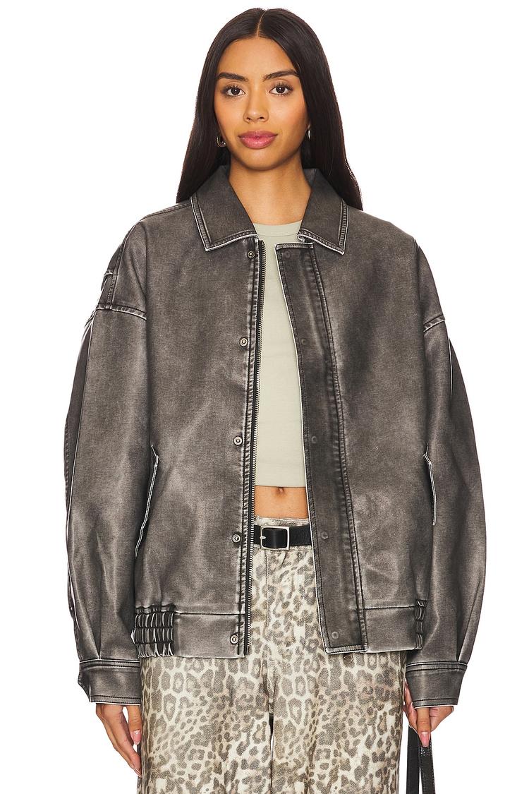 This matte dark gray bomber jacket features a relaxed loose fit with a classic turn-down collar and long drop-shoulder sleeves. Crafted from polyester with a subtle matte finish, it sits at the waist length for easy layering. The jacket is designed with front zipper and snap button closures, complemented by flap pockets with snap closures for secure storage. Functional zipper pockets add practicality, while the covered back and simple silhouette maintain a casual chic street style vibe. Ideal for casual outings, streetwear looks, and travel during autumn, winter, and spring seasons.