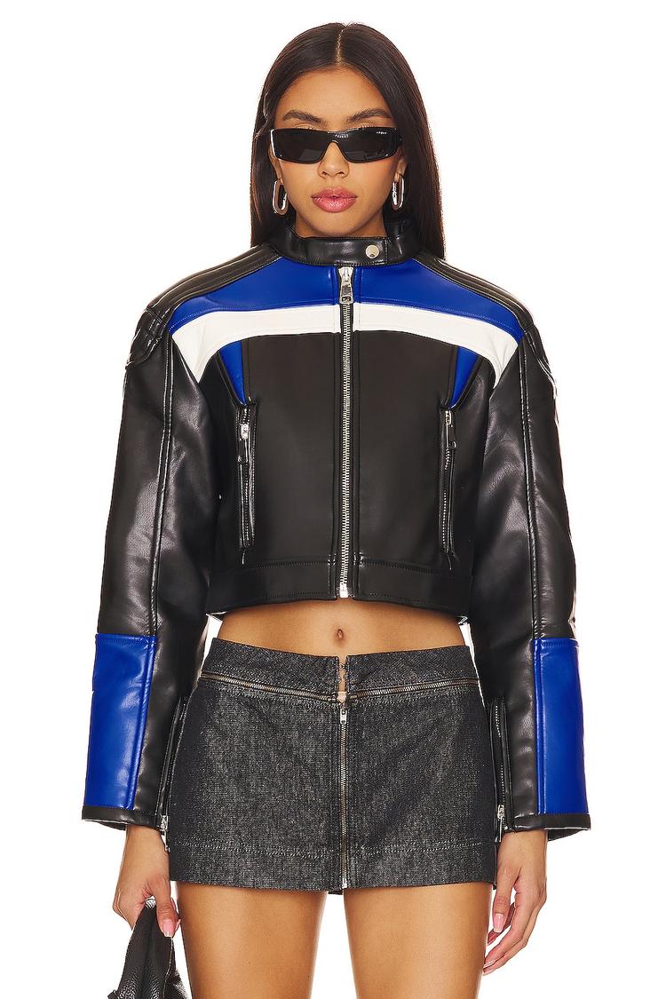 This cropped biker-moto jacket features a matte black faux leather fabric with striking color-blocked panels in bright blue and white across the chest and sleeves. Designed with a stand collar and long regular sleeves, it includes exposed zipper details on the front and cuffs, adding an edgy, street-style vibe. The front zipper closure is complemented by a snap button at the collar, while side slip pockets enhance its functionality. Perfect for casual, streetwear, and night out occasions during autumn to spring, this modern jacket embodies a bold, youthful aesthetic.