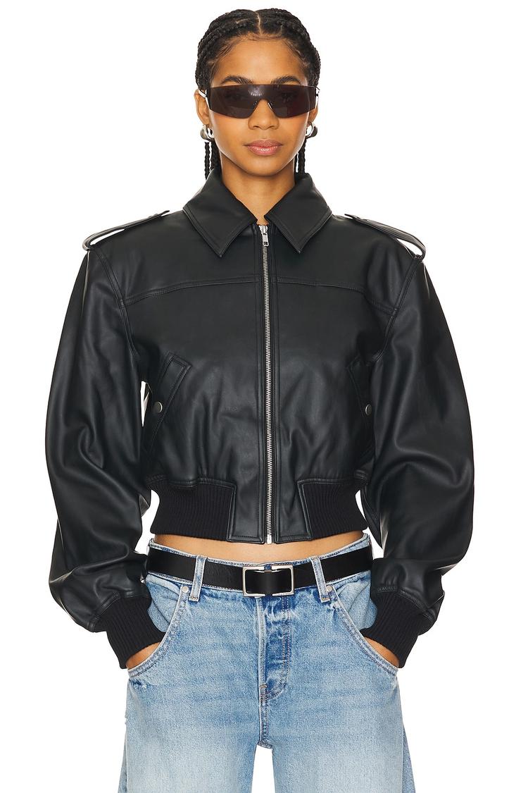 This Dylan Faux Leather Bomber Jacket features a matte black finish with a fitted silhouette and waist-length cut. Designed with a classic turn-down collar and long drop-shoulder sleeves, it includes epaulettes on the shoulders for an edgy detail. The jacket has a front zipper closure and functional pockets, lined with a polyester-viscose blend for comfort. Ideal for casual outings, streetwear looks, and travel during autumn, winter, or spring, this edgy bomber offers a modern, sleek style with practical functionality.