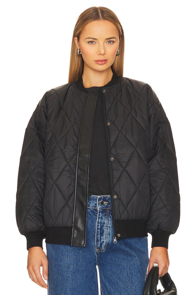 This Julie Quilted Jacket is a matte black, waist-length puffer-quilted jacket featuring a relaxed fit and long regular sleeves. It showcases a crew neck with ribbed neckline, cuffs, and hem, adding subtle texture and comfort. The jacket closes with a front zipper and snap button placket and includes side slant pockets for practical use. The all-over diamond quilting pattern enhances its minimalist, casual chic style, making it ideal for casual outings, streetwear looks, and travel during autumn, winter, and spring seasons.