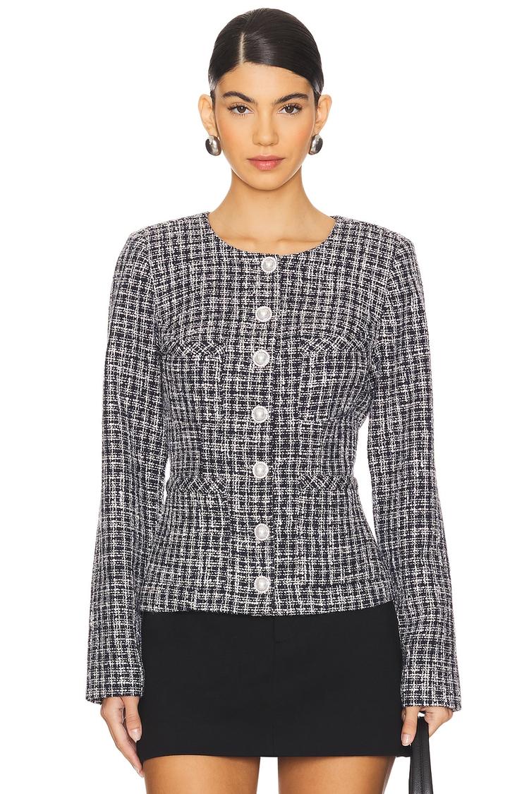 This tailored Evelyn Jacket features a classic single-breasted silhouette in a waist-length cut, crafted from a matte dark blue tweed nylon fabric with a white checkered pattern all over. The round neckline frames the face softly, while long regular sleeves complement the padded shoulders for a structured look. Front button closure with pearl-like buttons and four pockets add refined design details at the front. Fully lined with polyester and nylon-elastane blend, it offers comfort and style ideal for workwear, business casual events, and brunch outings during autumn, winter, and spring seasons.