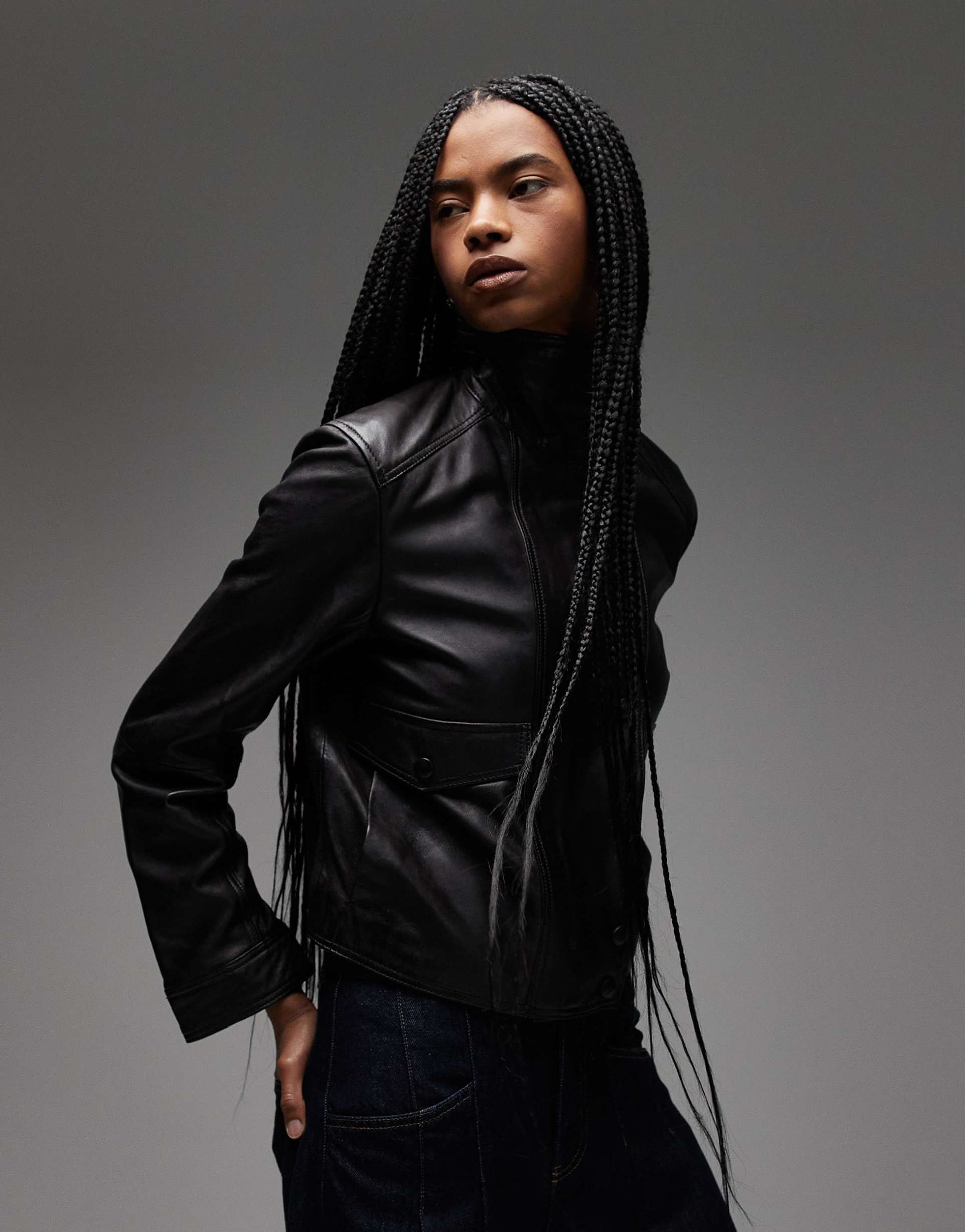 MANGO LEATHER FUNNEL NECK JACKET IN DARK BROWN