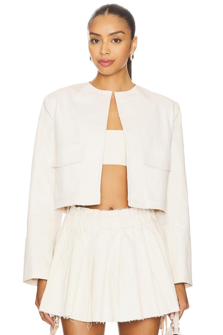This cropped jacket features a minimalist design in off-white cotton twill with a round neck and long sleeves. Its regular fit is complemented by padded shoulders with epaulettes, adding subtle structure and texture. The open front styling and front pouch pockets provide easy wear and practical functionality. Ideal for spring and autumn, this versatile piece suits casual outings, workwear, and brunch occasions, elevating simple looks with its clean lines and classic appeal.