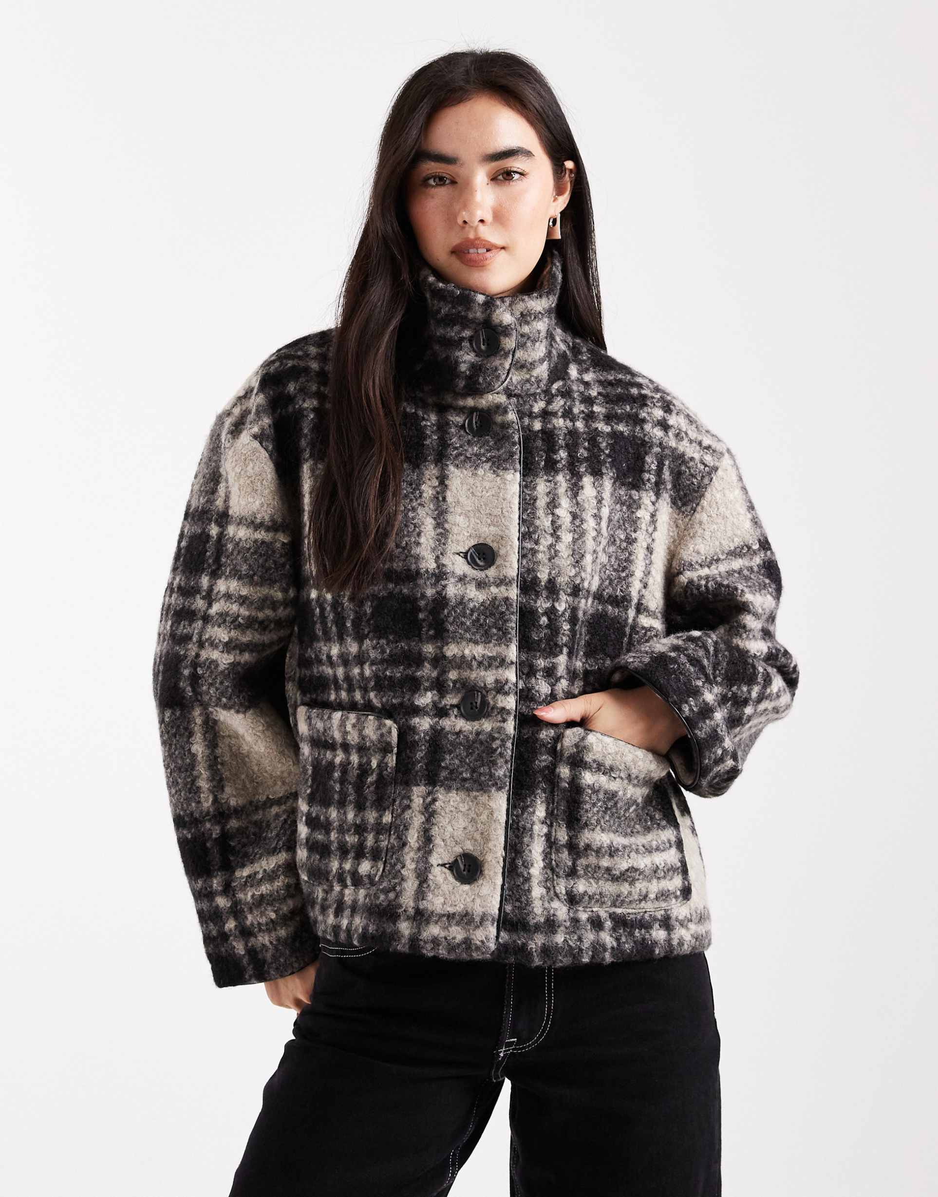 This Miss Selfridge cropped jacket showcases a classic checkered pattern in muted black, beige, and cream hues across a textured boucle fabric. The boxy fit and high collar give it a modern yet timeless silhouette, while long regular sleeves and a button-front placket provide practical style. Two patch pockets add functionality, and the polyester lining ensures comfortable wear. Perfect for casual streetwear and transitional seasons like autumn and spring, this jacket offers both warmth and style for workwear and everyday layering.