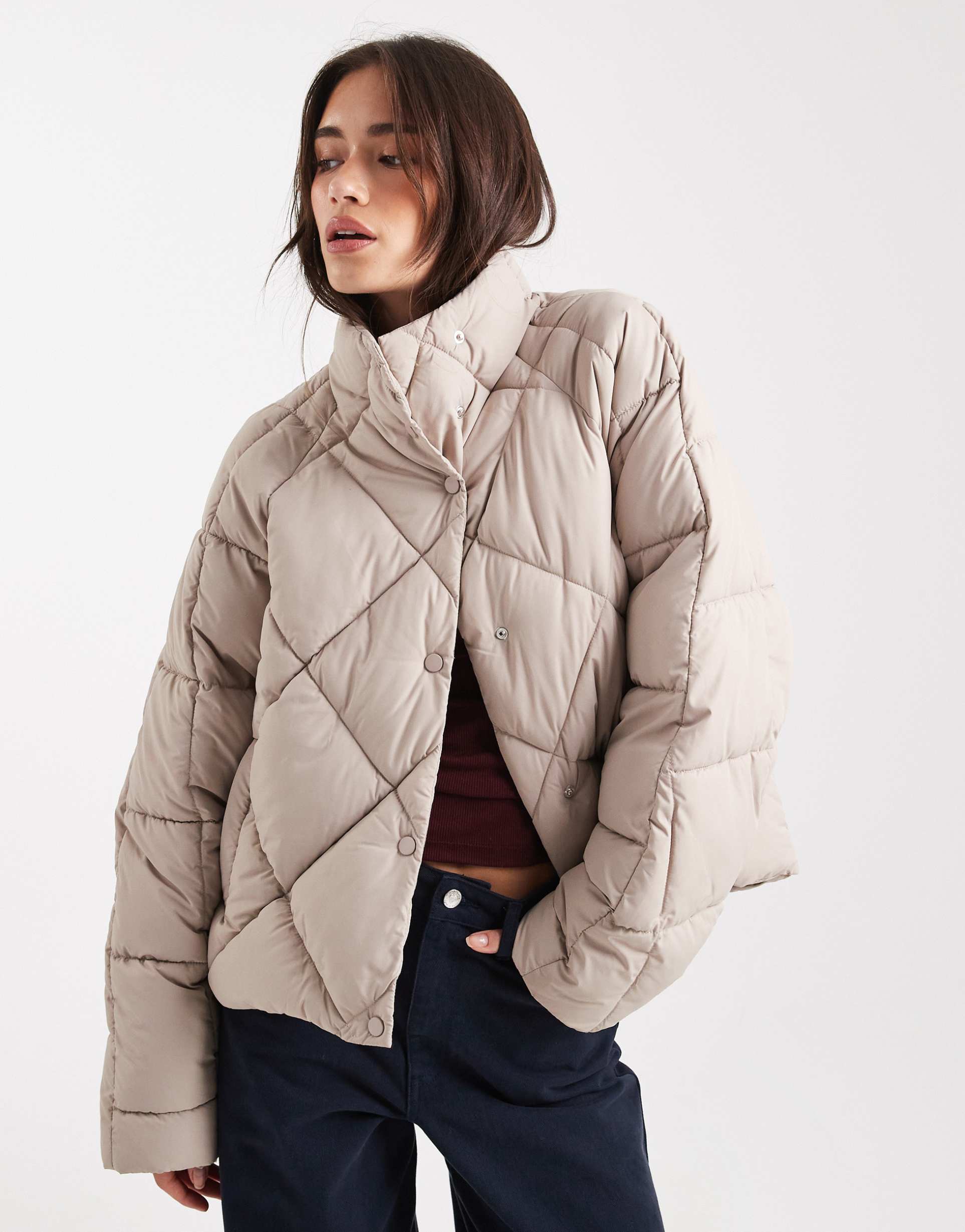 This oversized puffer jacket features a quilted design with a cozy funnel neck collar and long drop-shoulder sleeves. Crafted from woven polyester fabric with polyester lining, it offers warmth and comfort for autumn and winter seasons. The cropped length and regular fit provide a modern silhouette, while the snap button placket adds ease to the closure. Quilting details cover the entire jacket, enhancing its texture and casual chic style. Ideal for casual outings, travel, and streetwear, this mocha-colored jacket combines functional pockets with stylish design for everyday layering.