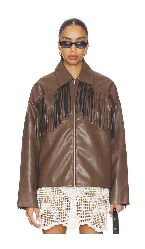 MORE TO COME MIA FAUX LEATHER JACKET IN BROWN.