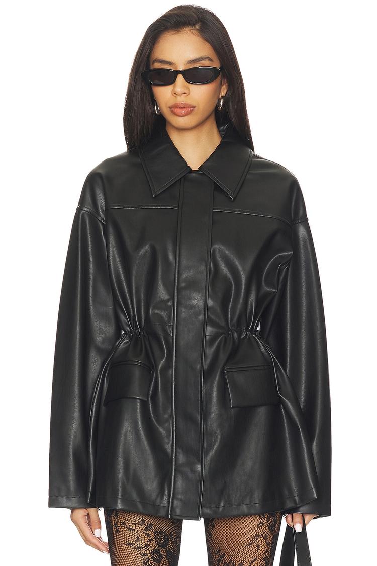 This sleek Utility jacket features a hip-length silhouette in matte black faux leather with a turn-down collar and long regular sleeves. The adjustable cinched waist adds shape and versatility, complemented by functional faux front panel pockets. A front zipper combined with snap button closures ensures secure wear. Crafted from a cotton-polyurethane blend, this minimalist and modern jacket offers a casual chic look perfect for streetwear, casual outings, and travel during autumn, winter, or spring.