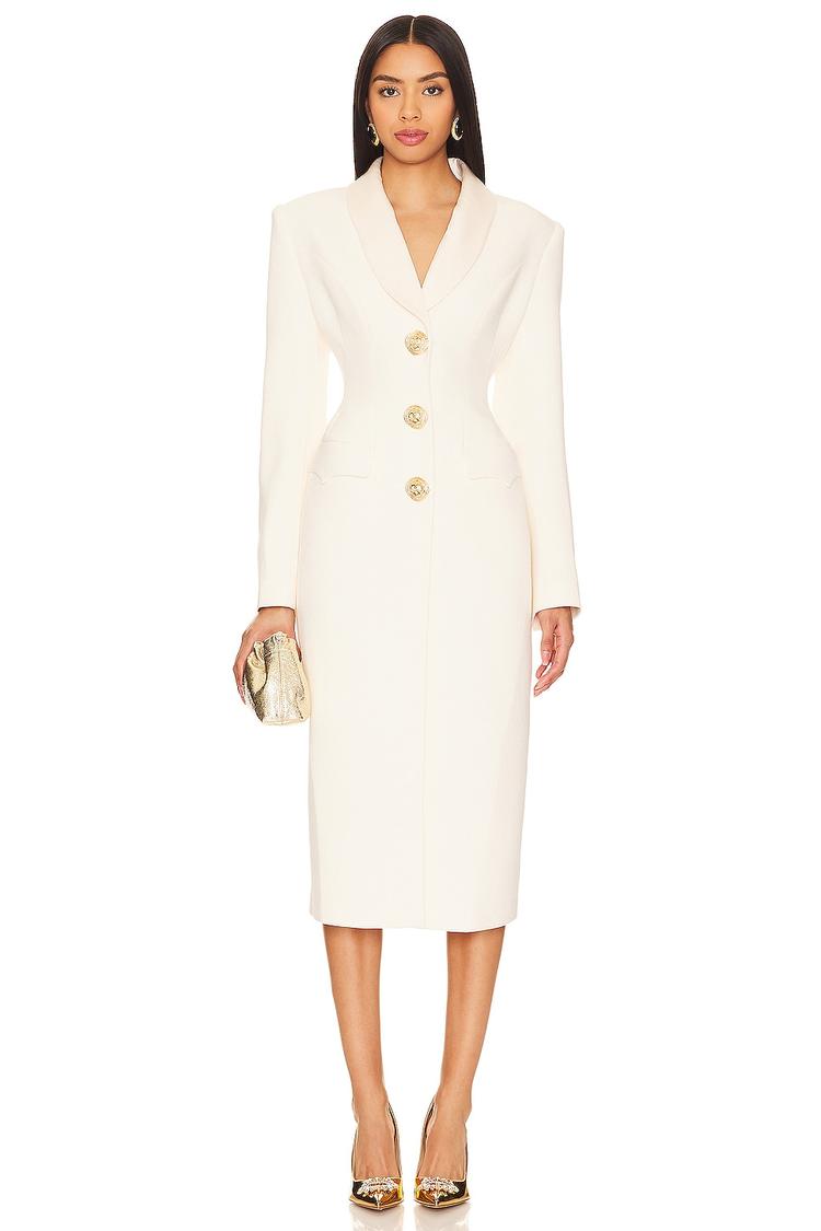 This tailored single-breasted long suit jacket features a calf-length silhouette in a smooth off-white crepe fabric blend of polyester, spandex, and acetate. The elegant notch lapel collar and long regular sleeves complement its sophisticated style, enhanced by padded shoulders for structured appeal. The front closure is adorned with gold-tone snap buttons, adding refined detail, while side flap welt pockets offer functional convenience. Lined in polyester with a midweight feel, this jacket is perfect for workwear, business casual, and formal occasions, delivering classic elegance and a polished finish.