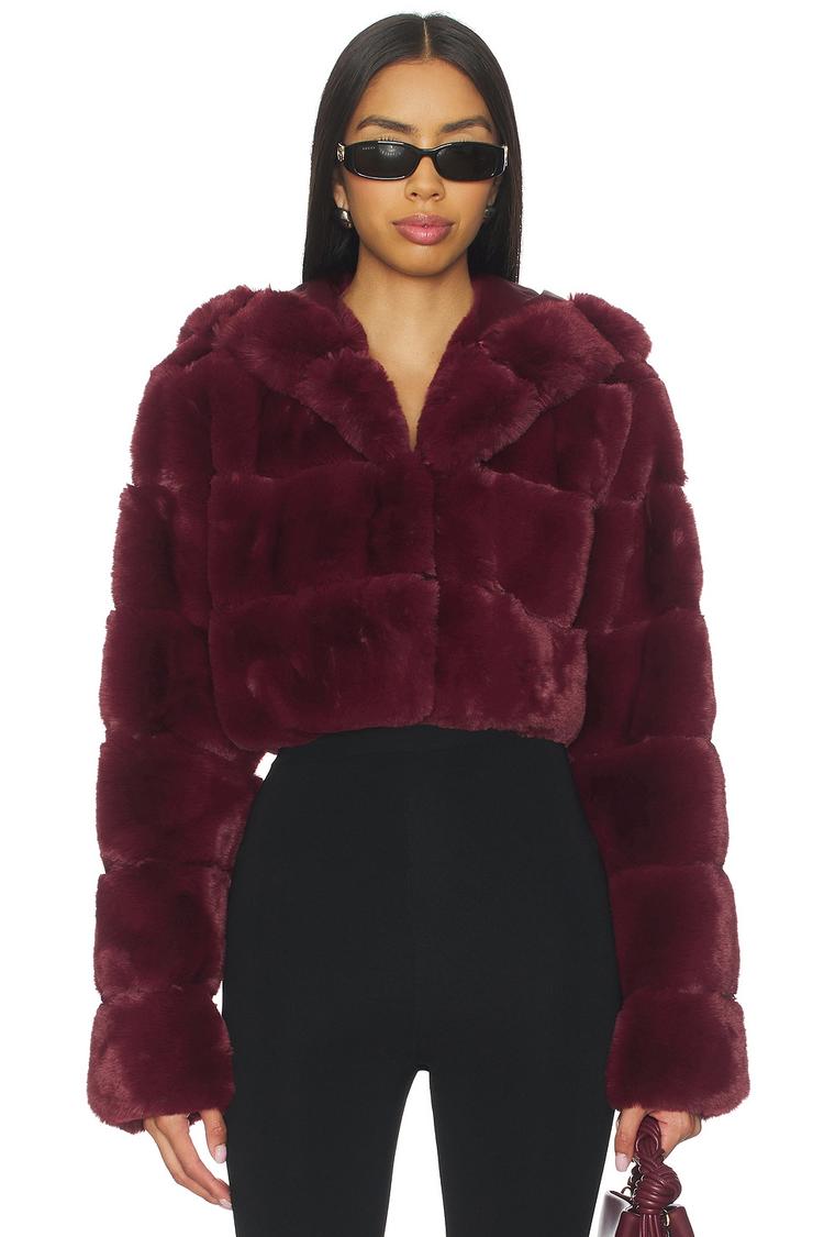 This cropped blouson jacket in a rich matte dark burgundy polyester features a plush, textured finish that adds depth and warmth. Designed with a hood and long regular sleeves, it offers a cozy yet stylish silhouette with a front hook and eye closure for a clean look. The regular fit and covered back enhance its versatile appeal, perfect for casual outings, date nights, and chic evening events during autumn and winter. Its trendy, cozy texture makes it a standout piece for layering with ease.
