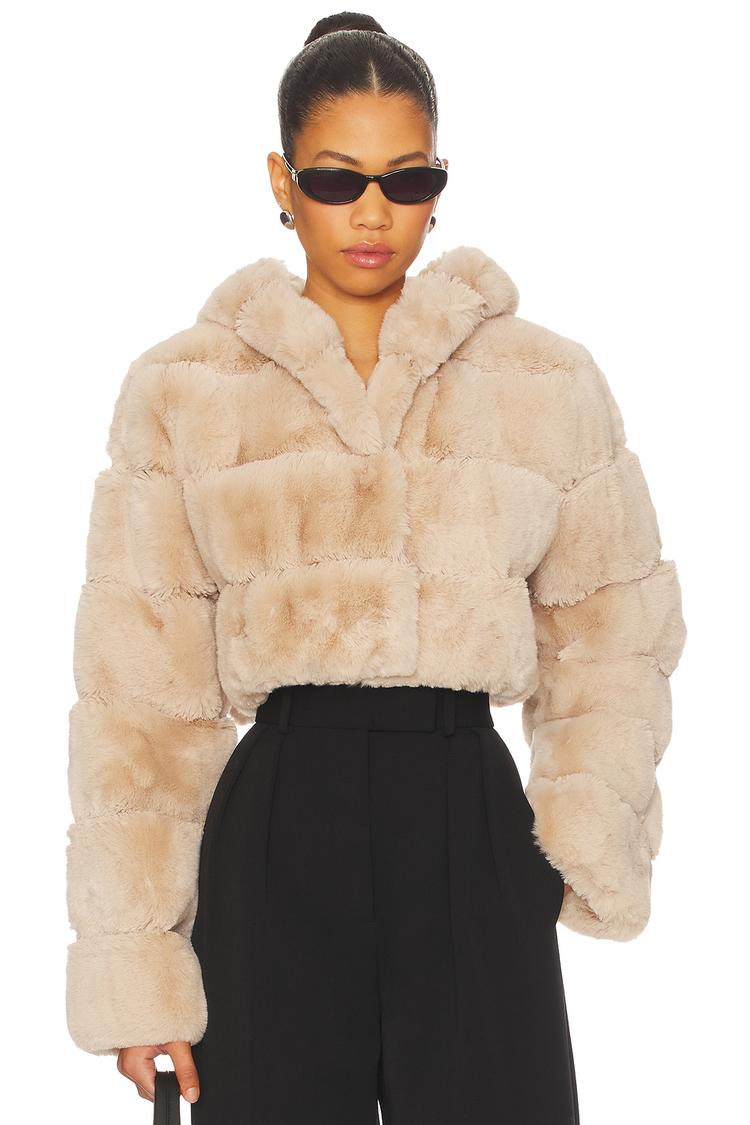 This chic Kira jacket features a cropped blouson silhouette crafted from plush faux fur in a soft light beige tone. It includes a cozy hood and long regular sleeves, finished with a front hook and eye closure. The regular fit and textured fabric make it a stylish choice for winter and autumn casual outings, date nights, or evening events. Its luxe appearance and comfortable design create a trendy outerwear option that pairs well with high-waisted pants or skirts for a refined yet cozy look.