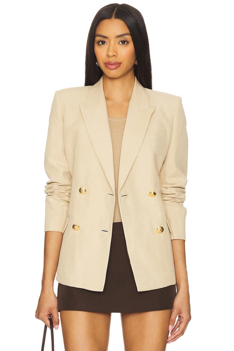This tailored single-breasted blazer in a soft beige hue features a notched lapel collar and long regular sleeves. Crafted from a midweight linen and viscose blend with a smooth viscose lining, it delivers breathable comfort and a polished look. The hip-length silhouette is enhanced by gold-tone front buttons and padded shoulders that add structure. Functional faux flap and breast welt pockets provide subtle utility, while vented back detailing ensures ease of movement. Perfect for business casual, workwear, or conference settings, this elegant jacket embodies timeless sophistication with a modern edge.