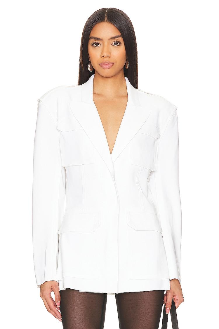 This Norma Kamali Single Breasted Cargo Jacket in bright white crepe suiting fabric offers a sleek, thigh-length silhouette with a fitted cut. Featuring classic notch lapels, padded shoulders for structured elegance, and long regular sleeves, this jacket closes with front buttons and includes functional pockets. Fully lined in polyester for smooth wear, it balances professional sophistication with a touch of modern chic, making it perfect for workwear, business casual occasions, and stylish nights out.