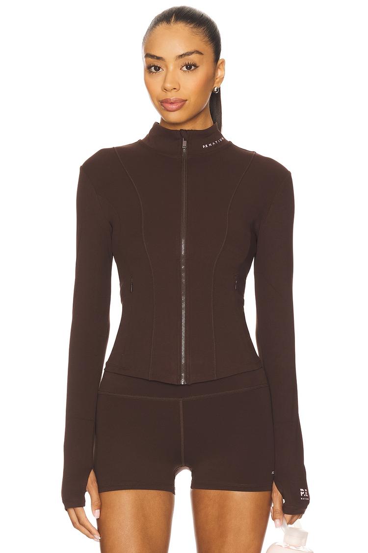 This fitted utility jacket in matte dark brown nylon-elastane blend offers a sleek, sporty chic silhouette ideal for athleisure and workout occasions. It features a waist-length cut with a stand collar and a hidden hood option, plus long regular sleeves with functional thumbholes. The front zipper closure is complemented by exposed zippers on outer and interior pockets, enhancing both style and practicality. Designed for all-weather wear, its modern design balances performance and fashion, making it perfect for travel, fitness, and casual streetwear.
