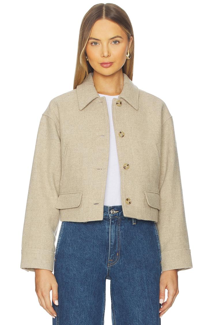 This Paige Alfie Jacket features a classic single-breasted silhouette with a waist-length cut and regular fit, crafted from brushed wool twill with polyester and viscose lining for comfort. It has a turn-down collar, long regular sleeves with buttoned cuffs, and a front button closure. The jacket includes front lower faux flap pockets and side seam pockets for functional style. Its minimalist beige tone and matte finish make it versatile for casual wear, workwear, and business casual occasions during autumn, winter, and spring seasons.