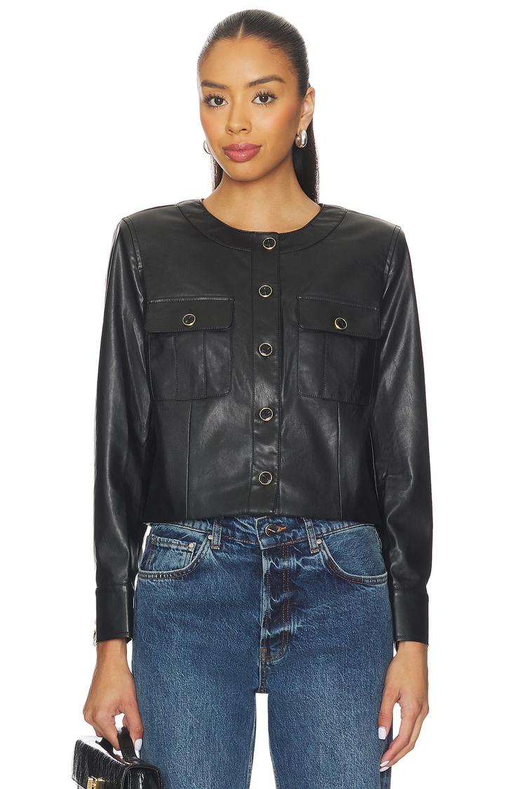 This Paige Verity Jacket features a sleek, matte black faux leather fabric with a fitted, waist-length silhouette ideal for autumn and spring layering. The single-breasted design is highlighted by a round neckline and long regular sleeves with buttoned cuffs. Light padding at the shoulders adds subtle structure, complemented by flap breast pockets with button snap closures. Fully lined with polyester and a touch of spandex, it offers comfort and ease. Perfect for casual outings, streetwear looks, or smart workwear, this jacket merges classic style with modern chic.