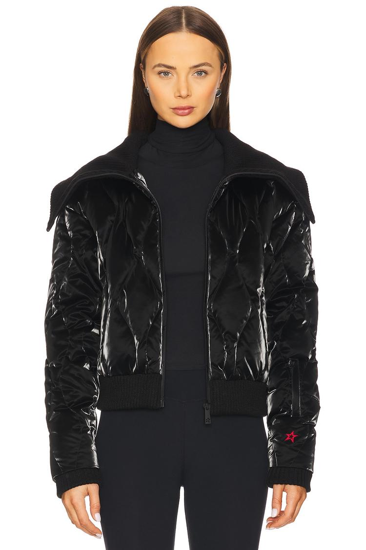 This Perfect Moment Carving Down Jacket features a waist-length, regular fit silhouette crafted from heavyweight ripstop polyester with a metallic black finish. The puffer-quilted design provides insulated warmth through its 90% goose down and 10% feather filling, enhanced by a stand collar and long regular sleeves for full coverage. The jacket includes front zip closure and zippered pockets, detailed with all-over quilting and ribbed trims. Its sporty chic and modern style make it ideal for casual wear, travel, and outdoor events during autumn and winter seasons.