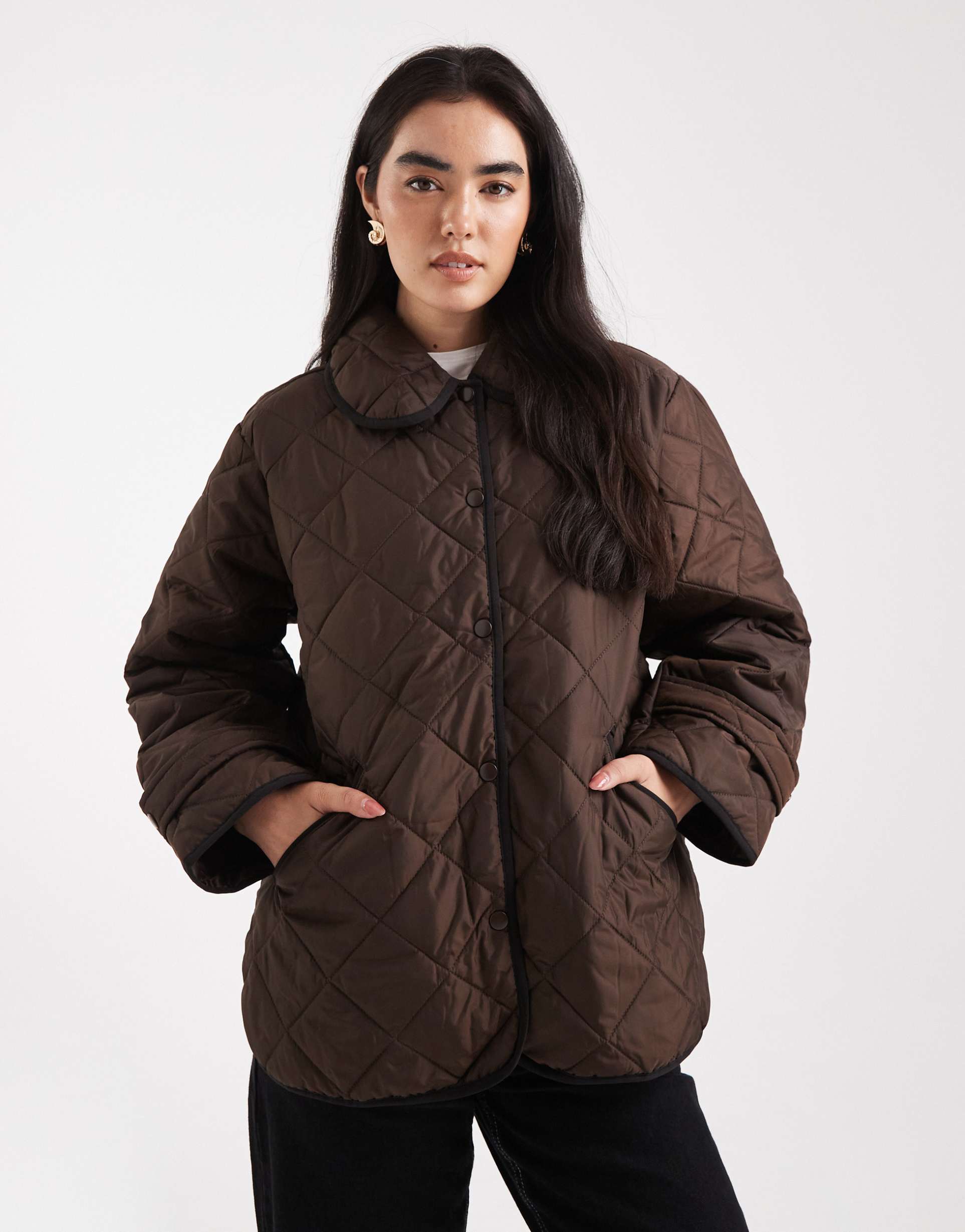 PIECES QUILTED JACKET WITH COLLAR DETAIL IN CHOCOLATE BROWN