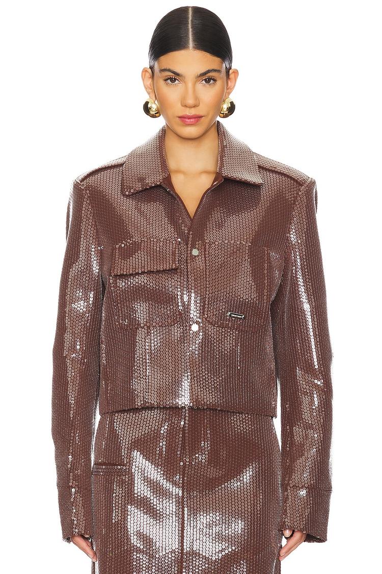 This cropped suit jacket features a tailored fit and is crafted from a sequin-embellished polyester fabric that offers a subtle shine. It includes a turn-down collar, long regular sleeves with snap button cuffs, and dual breast pockets with snap button closure. Padded shoulders add structure to the silhouette. The jacket is fully lined in polyester, enhancing comfort and durability. Its dark brown hue and sleek design make it ideal for business casual, cocktail events, and workwear occasions, combining modern elegance with sophisticated detailing.