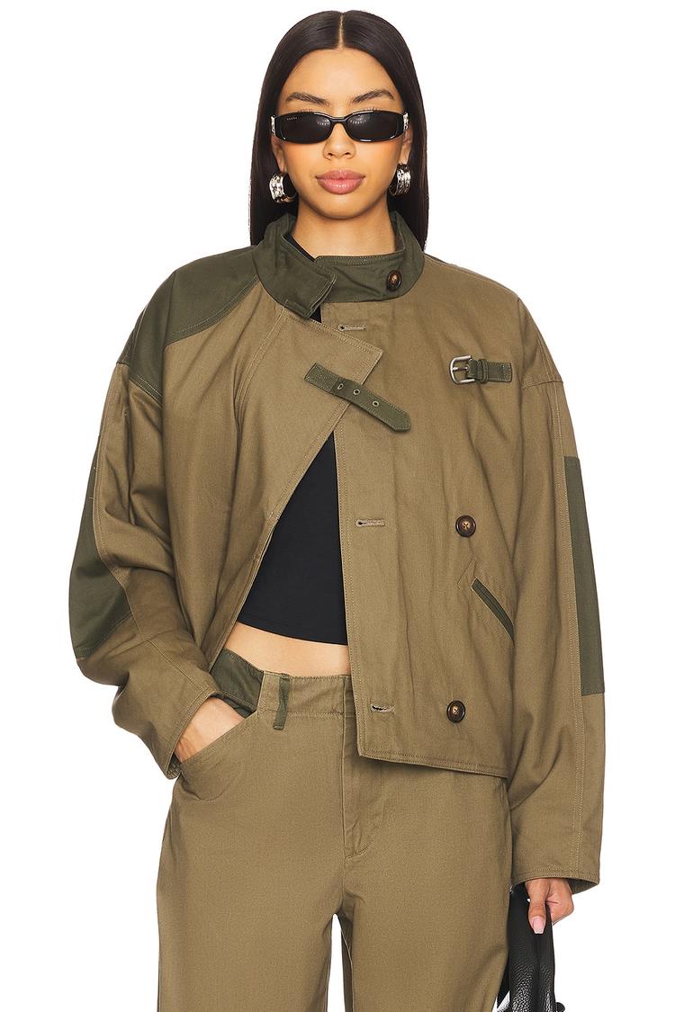 This boxy Tatum Jacket features a matte olive heavyweight twill fabric with quilted viscose and polyester lining for warmth. The waist-length silhouette has a stand collar with buckle and button closures for a modern utilitarian look. Drop-shoulder long sleeves and front slant welt pockets add functional style, while adjustable waist straps provide a customizable fit. Perfect for casual, travel, and streetwear occasions in autumn and winter, this jacket blends practical design with contemporary chic.
