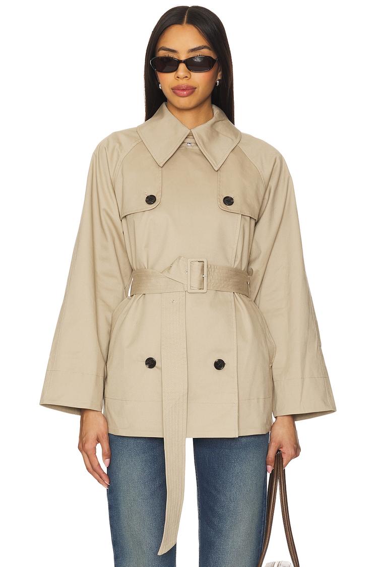 This beige car coat features a single-breasted silhouette with a regular fit, crafted from midweight cotton twill fabric for spring and autumn wear. It showcases a turn-down collar and long regular sleeves, complemented by a detachable belted accent that cinches the hip-length hem for added shape. Functional storm flap details and side pockets enhance its practicality, while a vented back adds classic style. Fully lined in cotton, this jacket closes with front buttons and a hook and eye at the collar, making it ideal for casual, workwear, and travel occasions.