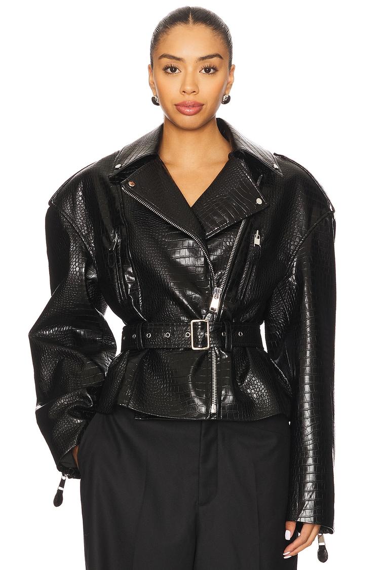 This Lilou Biker-Moto jacket features a matte black croc-embossed faux leather texture, giving it an edgy, modern appeal. Tailored with structured shoulders and classic lapels, it includes a front zipper closure and an attached waist belt for an adjustable fit. Long regular sleeves with zipper details and epaulettes on the shoulders add to its bold design. Waist-length and fitted, this jacket is perfect for casual streetwear or night out occasions in cooler seasons. Functional pockets and a storm flap complete this striking piece.
