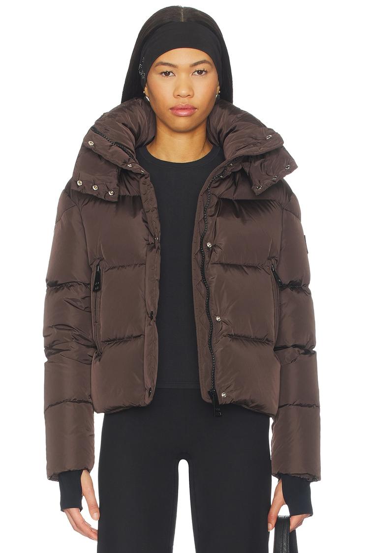 This Jordy Jacket is a waist-length puffer-quilted jacket featuring a matte dark brown nylon shell filled with 90% duck down and 10% feather for optimal warmth. Designed with a detachable hood, long regular sleeves with thumbhole cuffs, and side zip pockets, it offers both comfort and functionality. The jacket closes with a front zipper and snap buttons for added protection against cold. Its regular fit and sporty chic style make it perfect for casual outings, travel, and streetwear during autumn and winter seasons.