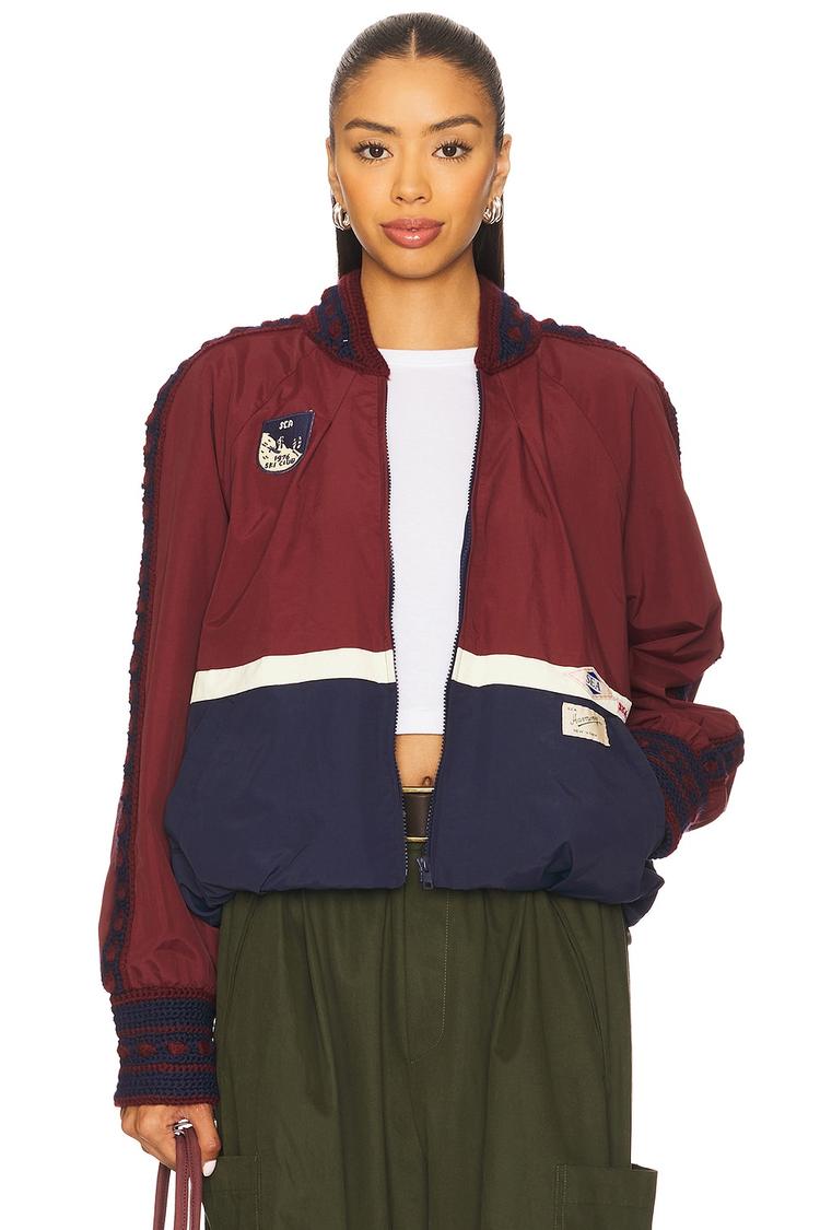 This Mira Windbreaker jacket blends sporty streetwear with casual chic style through its color-blocked design in matte burgundy, navy, and white. Crafted from lightweight nylon and polyester with a soft cotton lining, it features a stand collar, long regular sleeves with crochet contrast detailing along the sleeves, and a waist-length regular fit silhouette. The front zipper closure and slant zipper pockets add functional ease, making it perfect for casual outings, travel, and everyday street style layering during spring and autumn. The crochet trim on sleeves provides subtle texture and visual interest.