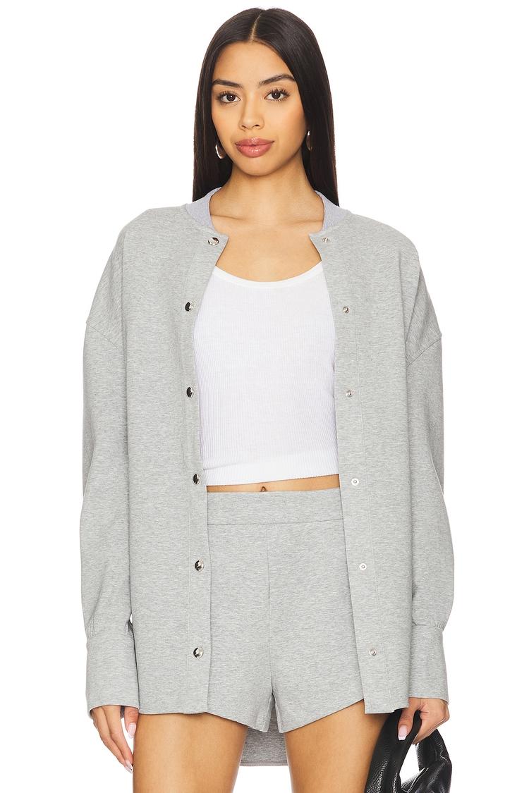 This Ayla Jacket features a minimalist, loose fit blouson silhouette in a light gray midweight stretch jersey fabric. It has a hip-length cut with long drop-shoulder sleeves and a ribbed band collar for a clean neckline. Silver snap button closures and cuffs add subtle shine, while side hem slits offer ease of movement. Perfect for casual streetwear or workwear during spring and autumn, its comfortable cotton-polyester-spandex blend ensures softness and stretch. The jacket's clean lines and understated design make it a versatile layering piece for relaxed, chic outfits.