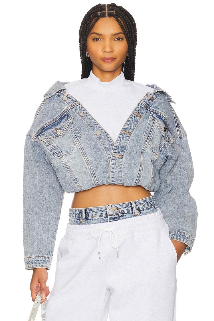 This Caroline cropped blouson jacket blends a light blue denim overlay with a white mockneck sweatshirt base for a layered, casual chic look. Featuring a loose fit and drop-shoulder long sleeves, it offers relaxed street style vibes. The pullover design and faux pockets contribute to its ease and comfort, while the cropped length enhances modern appeal. Crafted from a cotton-polyester blend, this jacket suits spring and autumn seasons perfectly. Ideal for casual outings, streetwear ensembles, and travel, it combines fashion-forward design with everyday practicality.