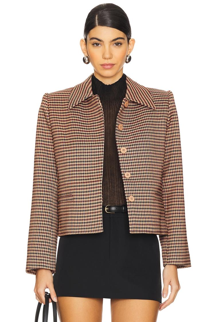 This Jessamine jacket features a classic tailored silhouette in a waist-length cut, crafted from midweight polyester broadcloth with a chic checkered pattern in beige, black, and burgundy. Designed with a turn-down collar and long regular sleeves, it offers a sophisticated yet minimalist style. The single-breasted front button closure and padded shoulders add subtle design detail and structure. Fully lined with polyester, this versatile jacket suits autumn through spring wear, ideal for casual outings, business casual settings, and workwear. Its timeless pattern and tailored fit make it a refined choice for polished layering.